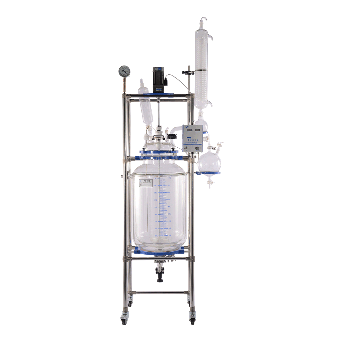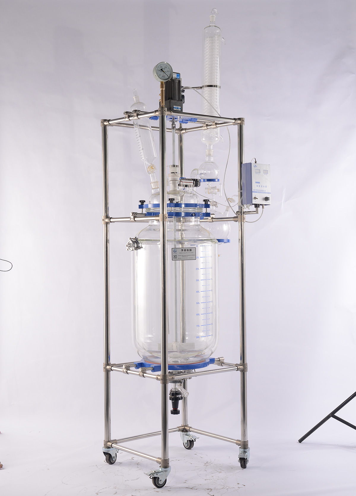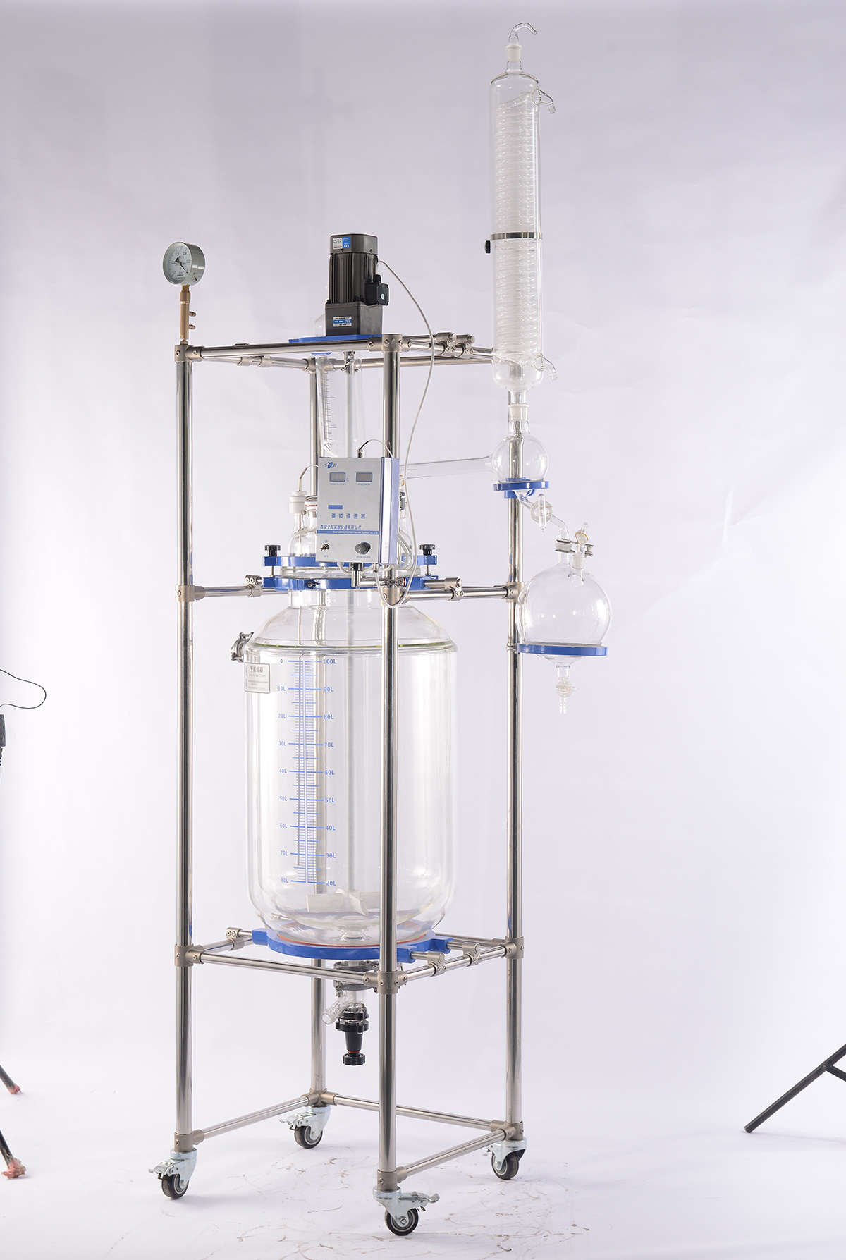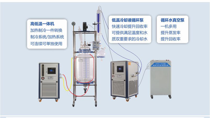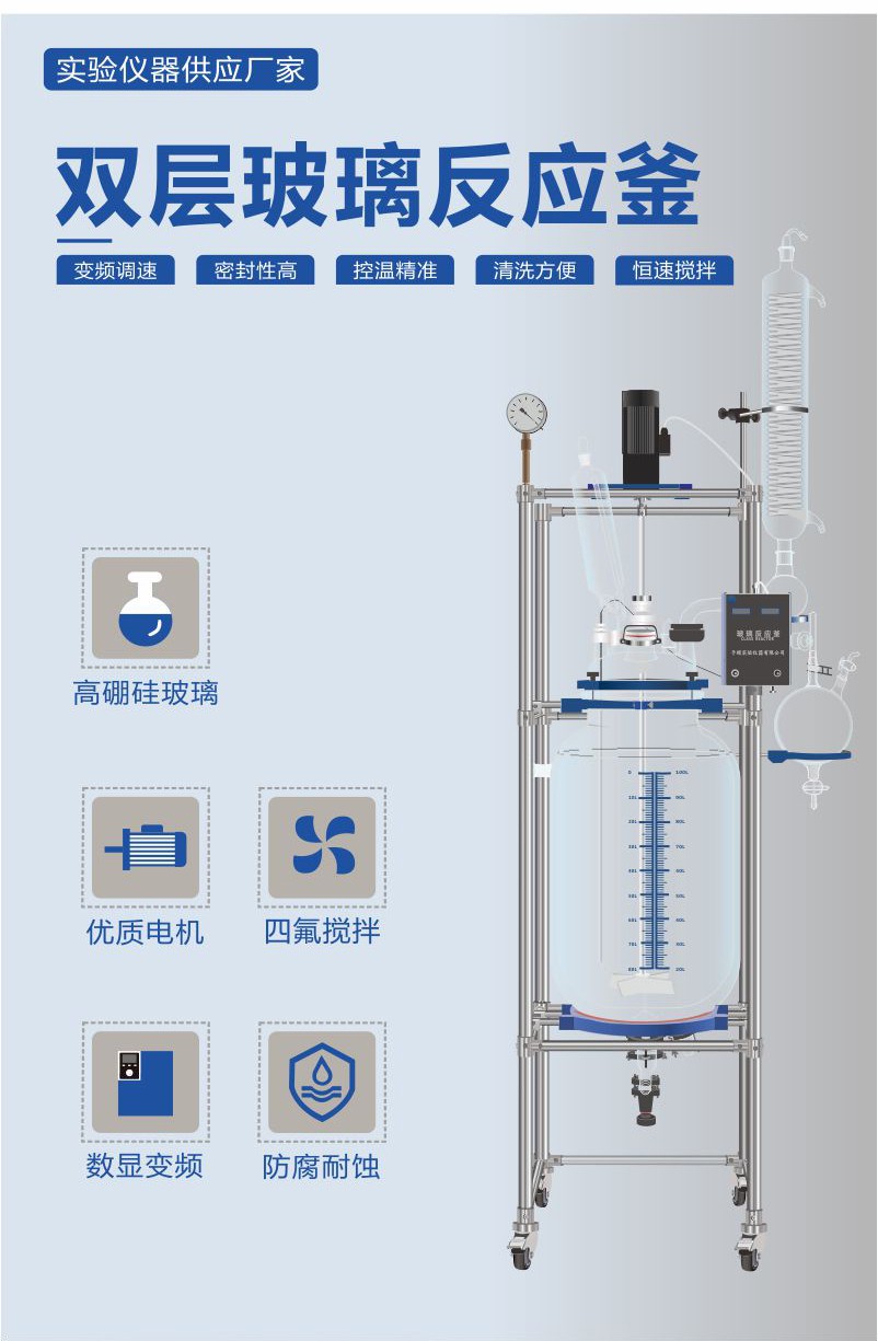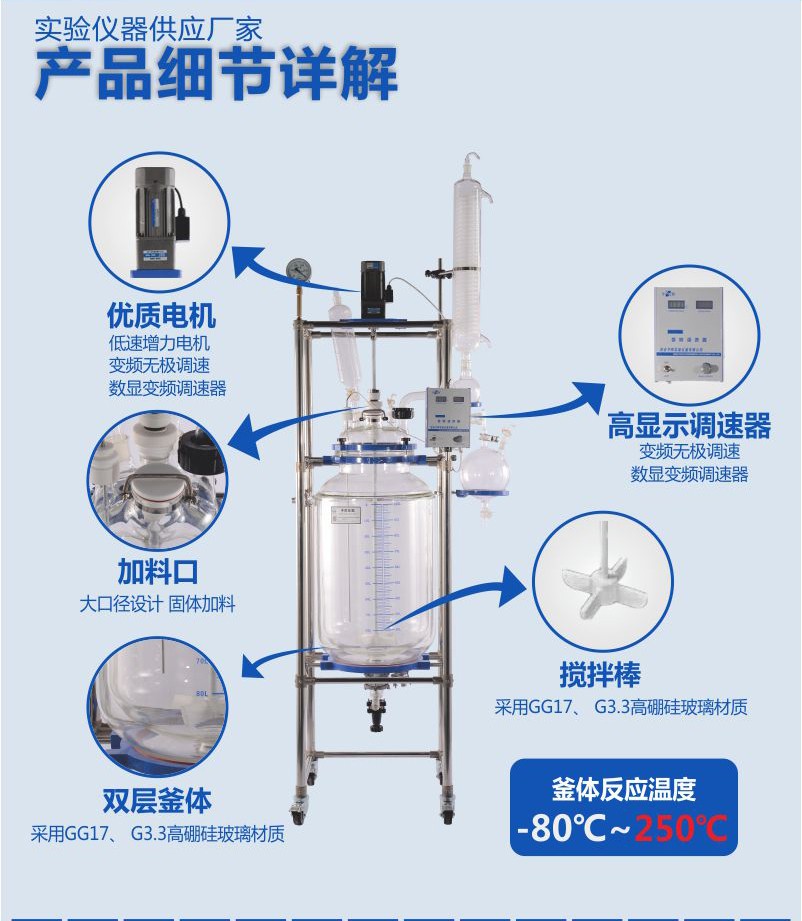 1.雙層玻璃反應(yīng)釜是常用的生化儀器,廣泛地被現(xiàn)代精細(xì)化工,生物制藥,科研實(shí)驗(yàn)等行業(yè)所選用,可在恒速,恒力,恒溫的條件下做濃縮,蒸餾,回餾,分離,提純反應(yīng),是教學(xué),實(shí)驗(yàn),中試,生產(chǎn)的理想儀器設(shè)備。產(chǎn)品可與循環(huán)水真空泵、隔膜真空泵、低溫循環(huán)泵、循環(huán)冷卻器、高溫恒溫循環(huán)器、低溫冷卻液循環(huán)泵、密閉制冷加熱循環(huán)裝置(又名:高低溫循環(huán)裝置)等配套組成系統(tǒng)裝置。